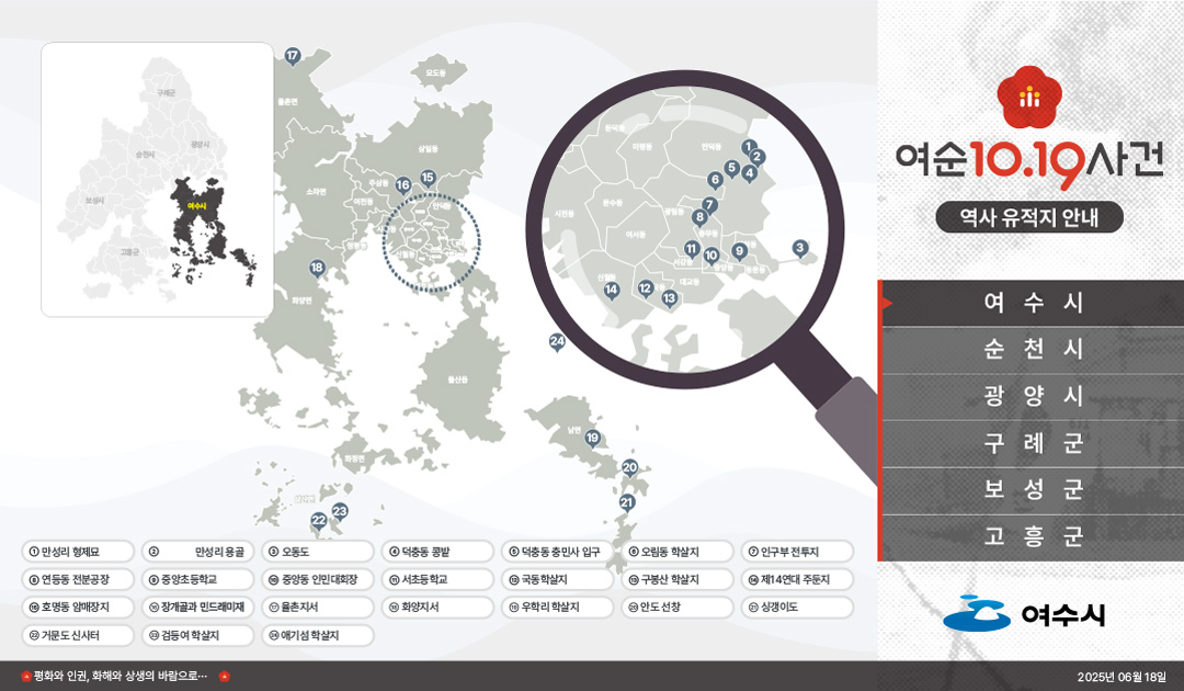 전남 여수시가 2025년 6월 18일 오전 10시 19분, 여순10·19사건 희생자를 추모하고 올바른 역사 인식을 확립하기 위한 ‘여순10·19사건 홍보관’ 개관식을 개최했습니다.